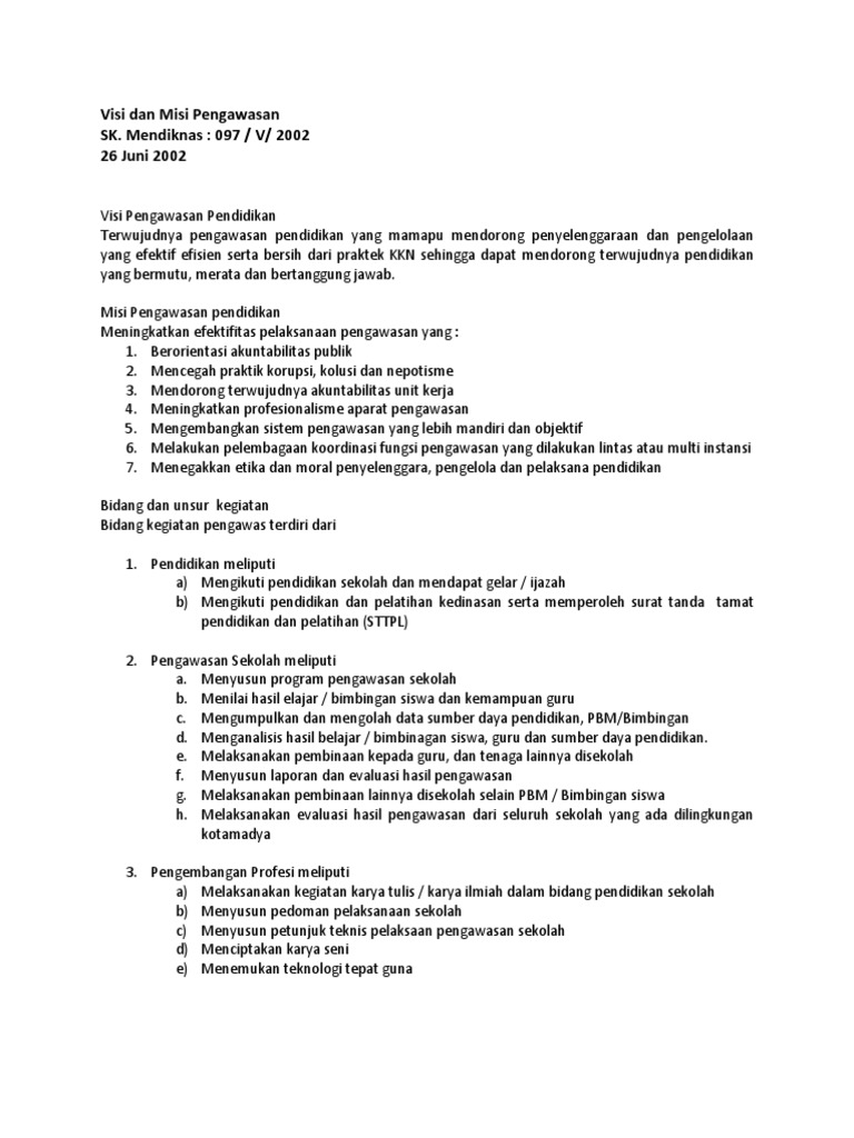 Proposal penilaian dan pengawasan a. 2 maksimal untuk memperoleh hasil dan pencapaian tujuan dalam sekolah tersebut. Visi pengawas sekolah indonesia merupakan wadah dan sarana perjuangan pengawas sekolah untuk mewujudkan pengabdian melalui pembinan yang profesional menuju tercapainya tujuan pendidikan nasional. b. Nama sekolah 2019 kata pengantar proposal konsep rencana kepengawasan. Sesuai dengan peraturan menteri pan & rb nomor 21 tahun 2010 pasal 5 disebutkan tugas pokok pengawas sekolah adalah melaksanakan tugas pengawasan akademik dan manajerial pada satuan pendidikan yang meliputi penyusunan program pengawasan, pelaksanaan pembinaan, pemantauan pelaksanaan 8 (delapan) standar nasional pendidikan, penilaian, pelaksanaan bimbingan dan pelatihan.
