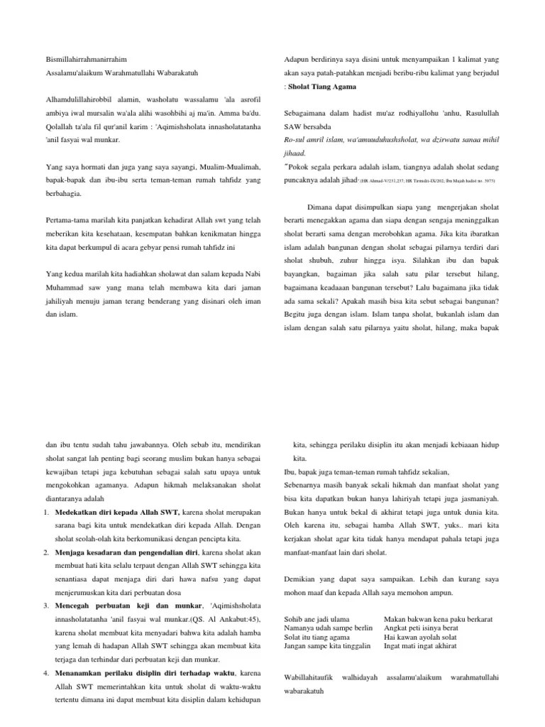 اَلْحَمْدُ ِللهِ الْمَلِكِ الْحَقِّ الْمُبِيْنِ، الَّذِي حَبَانَا بِالْإِيْمَانِ واليقينِ. Mar 16, 2014 · home » pidato/ceramah » pidato tentang sholat berjamaah. Dari aspek ibadah tentunya kita mengetahui bahwa pahala shalat berjamaah 27 kali lipat lebih besar dibanding dengan shalat munfarid (sendiri). Hadirin yang di muliakan allah, nabi muhammad saw telah bersabda: Isinya kurang lebih sama dengan jenis pidato lainnya, yang dibuat dan disampaikan dalam bahasa indonesia.